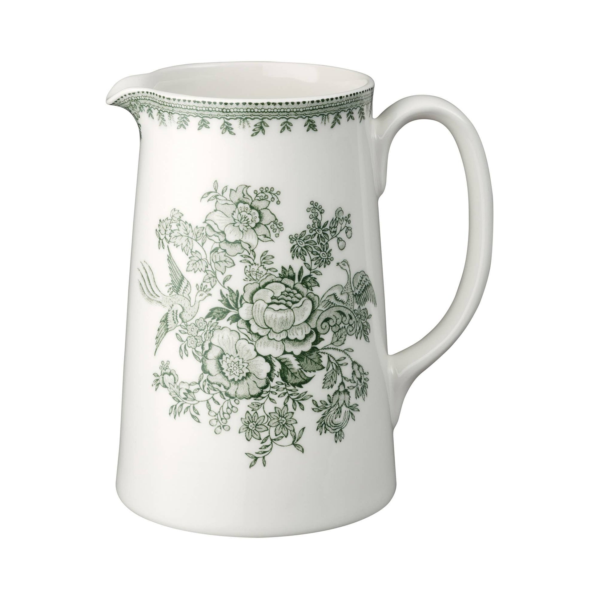 A classic design hand-decorated in Burleigh's timeless pattern, perfect for presenting fresh flowers from the garden or serving refreshments in style, this large Green Asiatic Pheasants Tankard Jug is a charming addition to the table. Uniquely decorated by skilled craftsmen with Burleigh's centuries-old technique of tissue transfer printing from hand-engraved copper rollers.